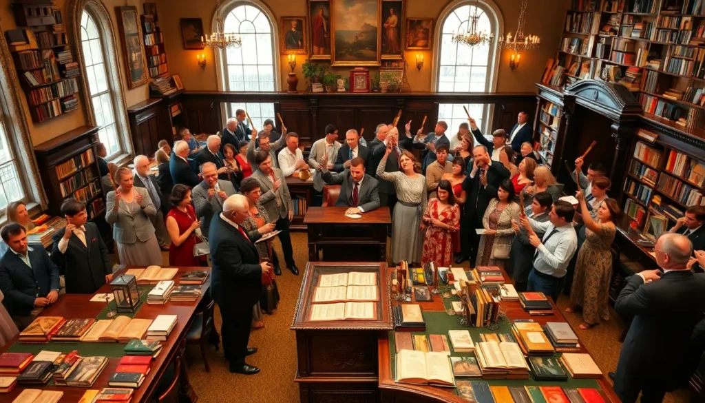 Participants experience the thrill of competition while discovering hidden gems. Auctions typically take place in historic venues, enhancing the ambiance. Experts often curate the collections, ensuring high-quality items are available for bidding. Regular attendees include both seasoned collectors and newcomers eager to explore the literary world.